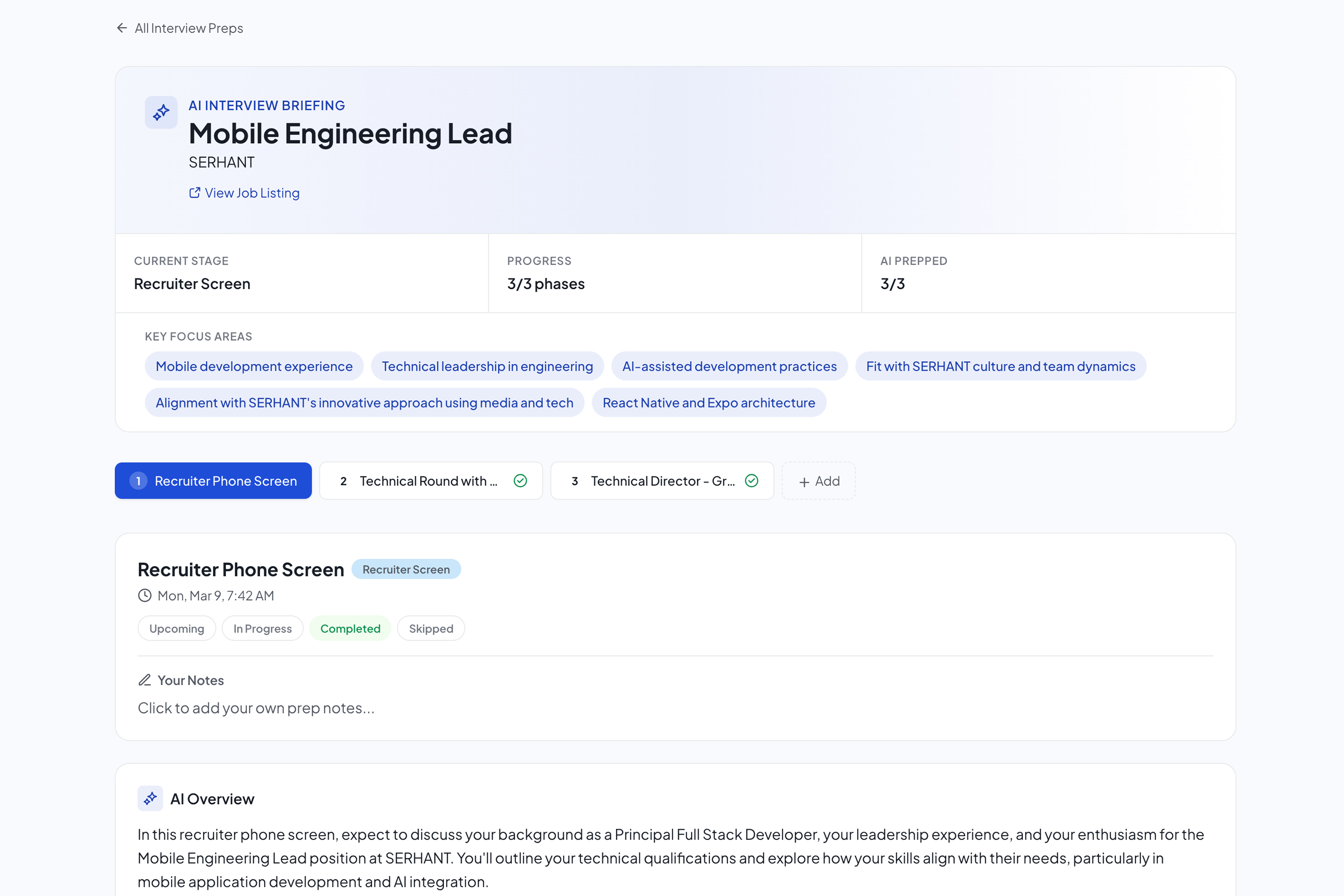 Paste your resume and the job description to unlock a personalized interview prep guide: expected questions, tailored talking points from your background, smart questions to ask, and key red flags to watch for.